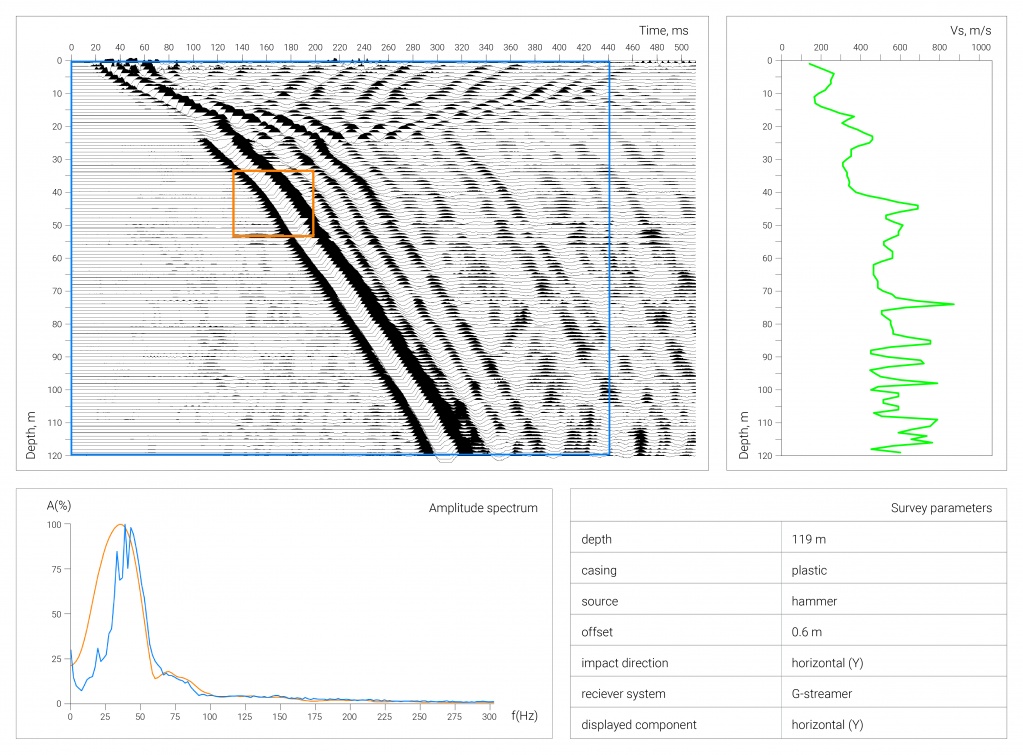 GStreamer has two geophones for each component with a natural frequency of 12 Hz. This grouping allowed to increase the sensitivity and at the same time maintain the minimum dimensions of the tool. Data registration is provided by almost any seismograph.