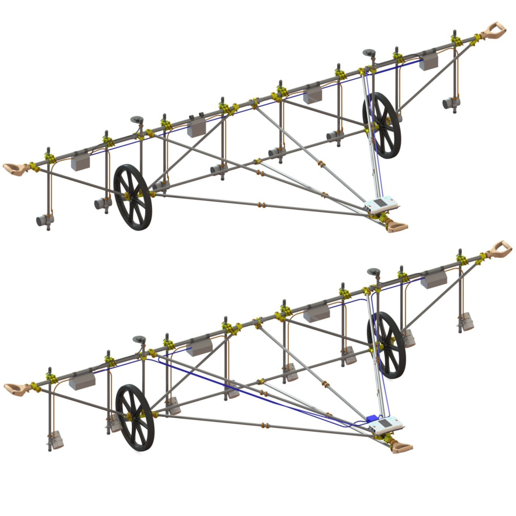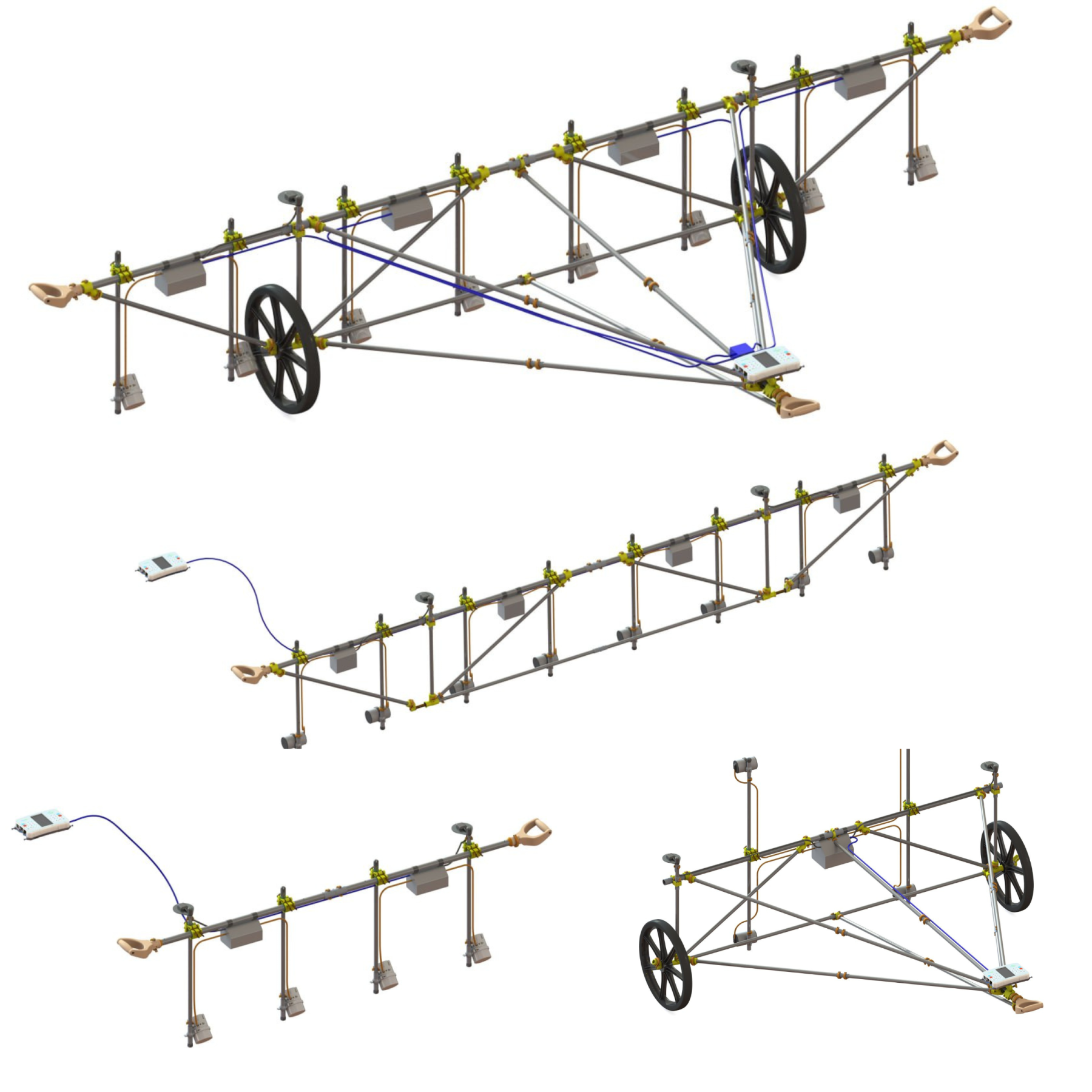 The non-magnetic cart can be used with any of our ground magnetometers: Overhauser MaxiMag and SmartMag or Cesium QuantumMag and SmartQuantumMag. The design of the devices is so unified that even sensors from the drone magnetometers AeroSmartMag and AeroQuantumMag, as well as the Cesium airborne sensors CSMx, can be mounted on the frame. This “omnivorous” design allows you to efficiently assemble a multi-sensor gradiometer from the entire range of instruments available for your project.