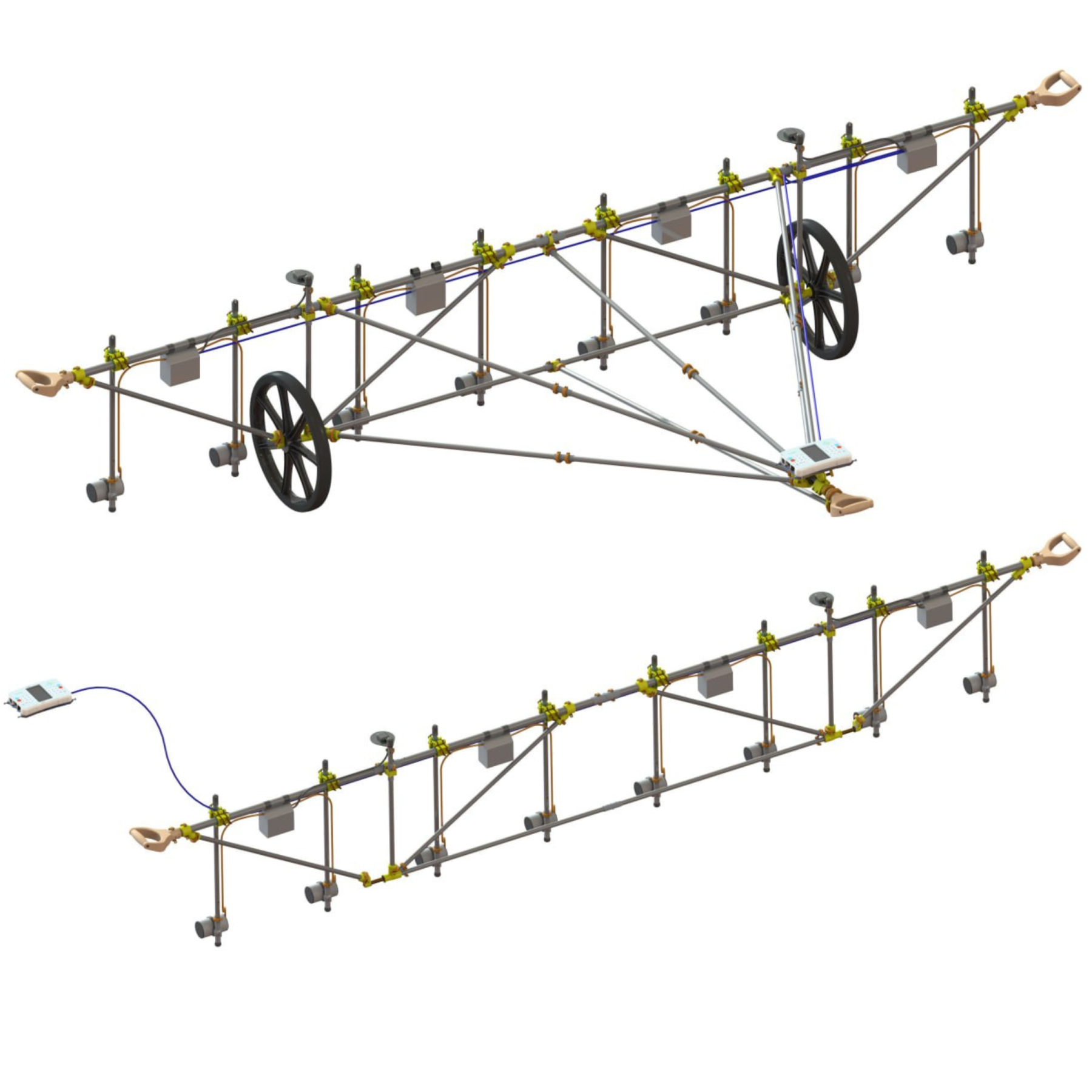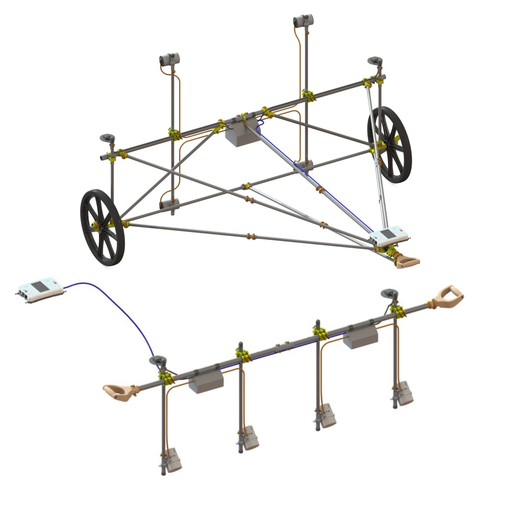We use durable and fully non-magnetic 51 cm (20'') diameter tubeless wheels. The optimized strength-calculated rigid frame is built from uniform carbon tubing of equal length for easy and intuitive assembly. The brackets are primarily made from 3D printed parts for reliability, minimal weight and easy replacement when needed. The frame is equipped with side handles for carrying the MagCart over obstacles. The MaxiMag console can be mounted in front of the cart handle or placed in a standard harness on the operator.