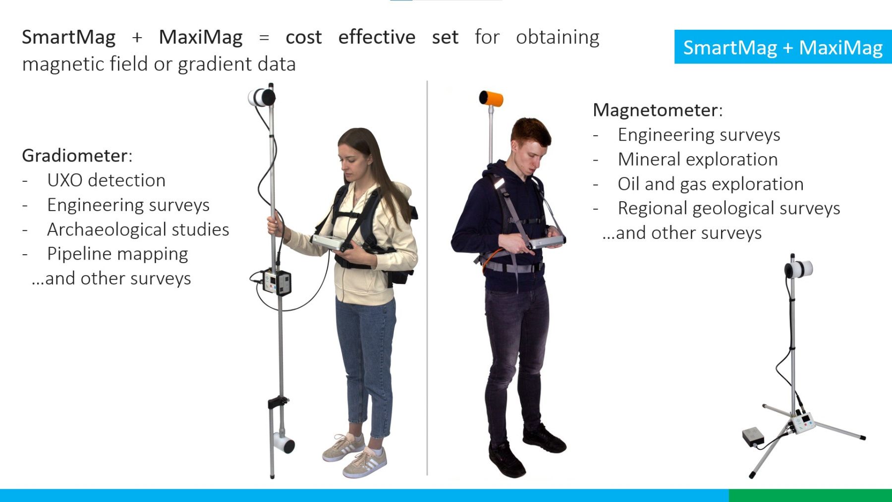 MaxiMag can be used as a walking magnetometer, two- or multi-sensor gradiometer, base station, observatory magnetometer, or even as a GNSS base and rover with centimeter accuracy in PPK mode. Console can be connected to a SmartMag magnetometers and recognizes them as a compatible sensors, so together they can be used as a walking magnetometer and a base station or as a gradiometer.