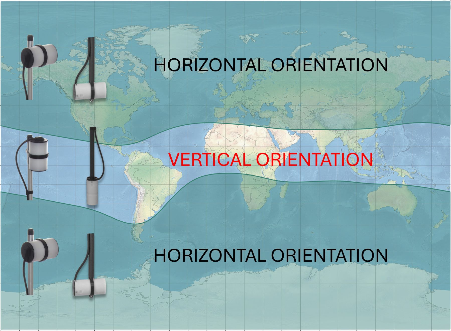 Our Overhauser magnetometers have no dead zones and can be used at any latitude. Simply keep the sensor in a vertical or horizontal position as shown in the diagram below to achieve maximum sensitivity, without worry about line direction or specific sensor orientation. This feature is especially important for UAV magnetometers operating in equatorial regions.