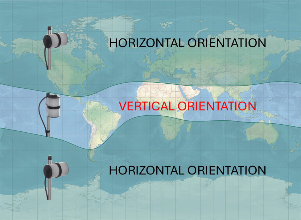 Our Overhauser magnetometers have no dead zones and can be used at any latitude. Simply keep the sensor in a vertical or horizontal position as shown in the diagram below to achieve maximum sensitivity, without worry about line direction or specific sensor orientation. This feature is especially important for UAV magnetometers operating in equatorial regions.