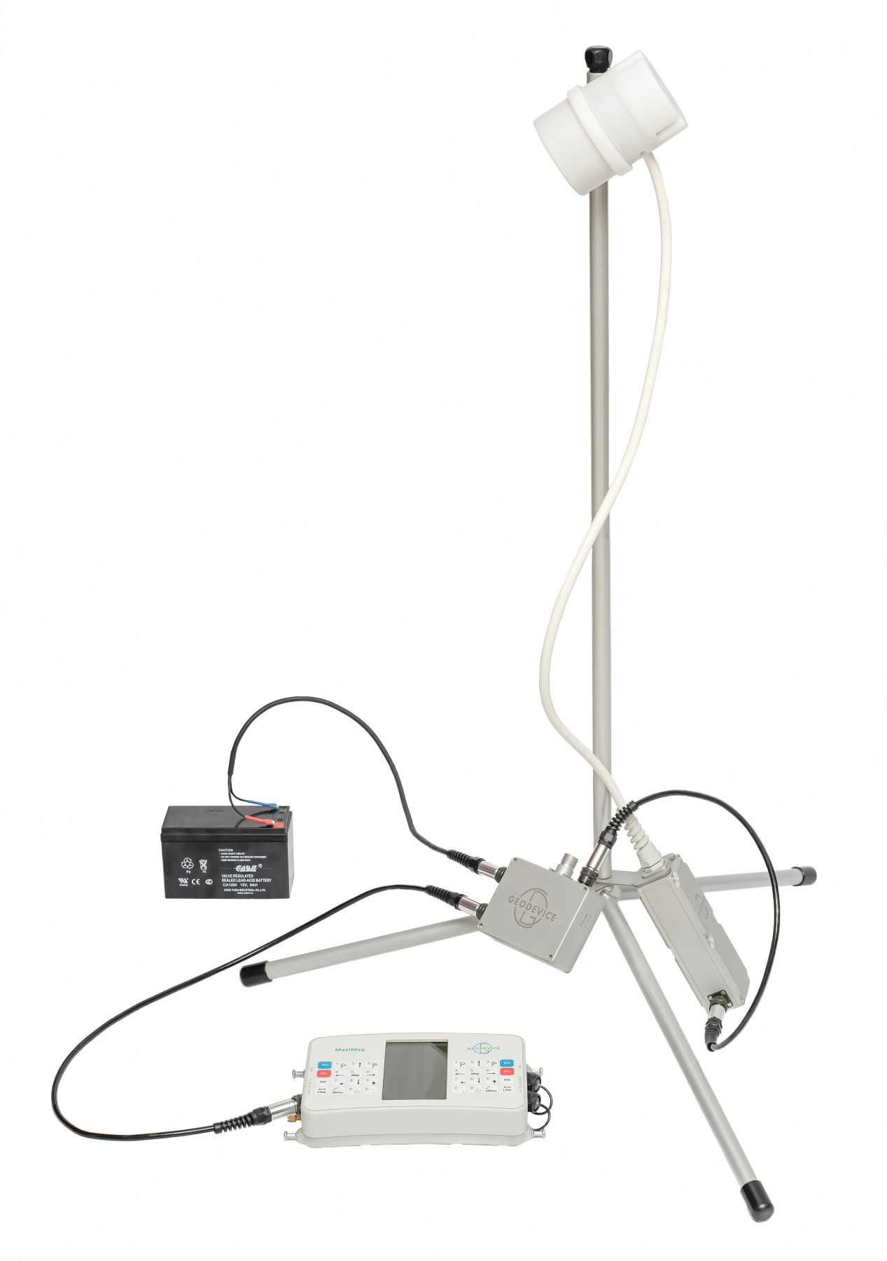 AeroQuantumMag is designed for UAV operations but can also be used as a base magnetometer during ground surveys with walking QuantumMag. In addition to the standard components of the two units, the set includes mounting brackets and a tripod for base magnetometer set-up.