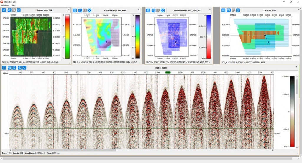 Large-scale seismic surveysInfield data quality control is a standard procedure during oil and gas acquisitions, which typically includes position data quality checks, seismic data quality control and their relationship. RadExPro has various instruments, including data and spectrum analysis in user-defined windows, attribute analysis as well as modern interactive displays to provide the full control during the survey.