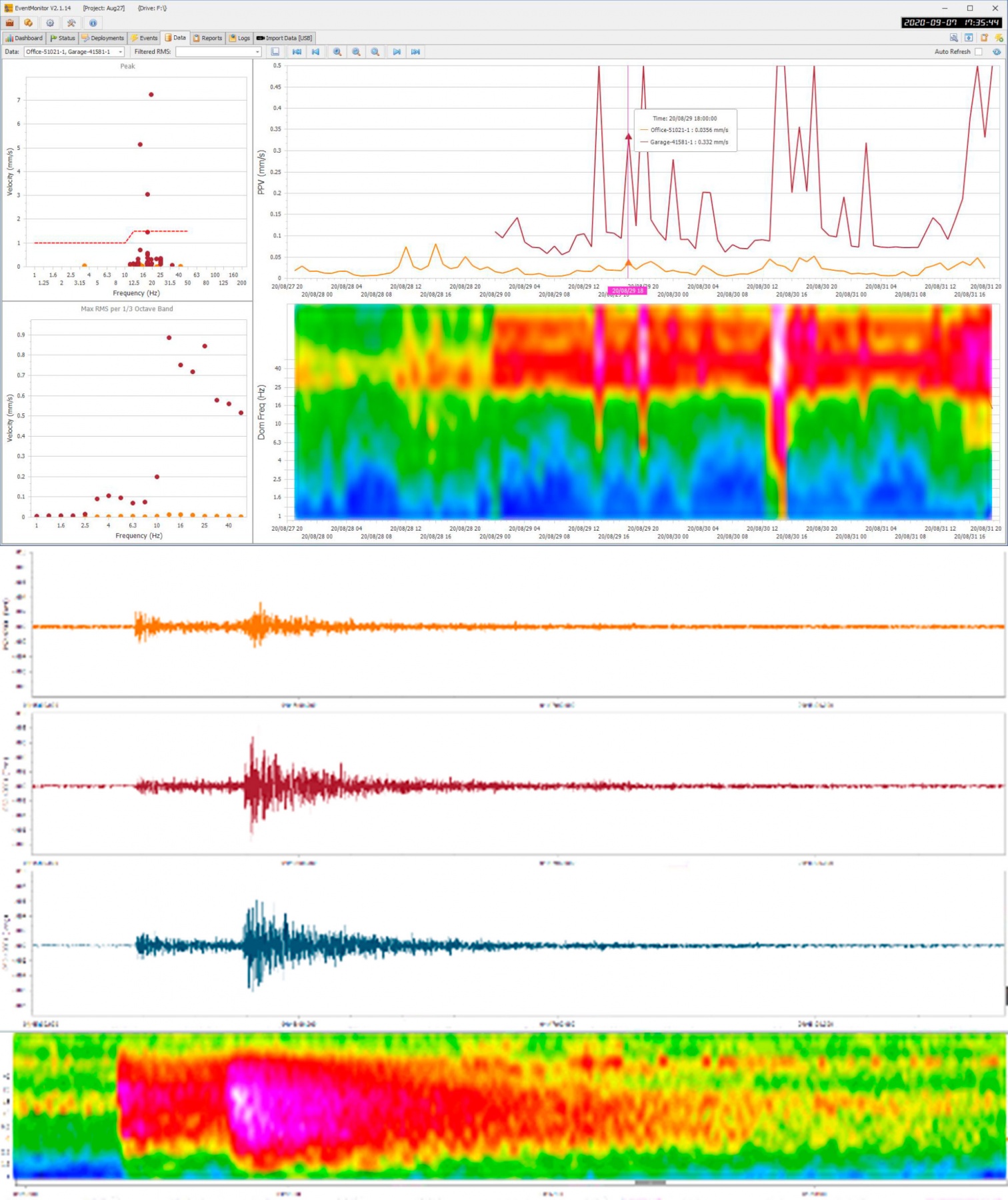 It is not always possible to realize synchronization between the source and the seismograph. It can be extremely problematic or impossible to deploy a wired synchronization line between the mines or from the tunnel to the surface while testing, and using a radio channel in these cases is simply not feasible. Seismic surveys in the city often impose similar restrictions. DAQlink4 and Sigma 4+ seismographs can keep long-term records on the built-in and external storage with time reference from the GNSS signal and an autonomous high-stability clock. One seismograph can be connected to the receiving array and the other to the source for shooting log formation - this allows performing synchronization in post-processing, i.e. to slice standard seismograms from the data array.