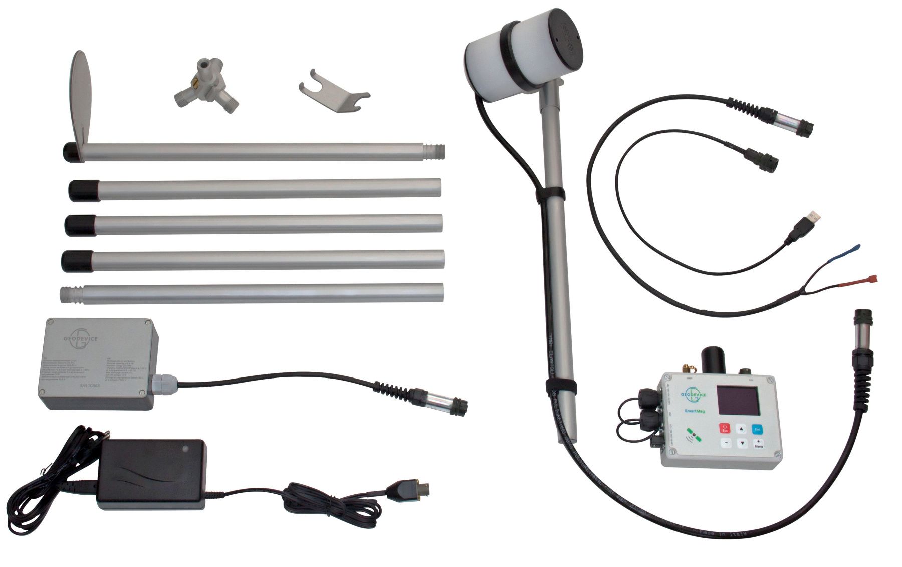 The magnetometer package contains on the one hand a minimum number of unified parts to ease assembly and use, and on the other hand all the necessary components, so that you do not have to buy additional cables, a battery, or GNSS receiver without which you will not be able to work.