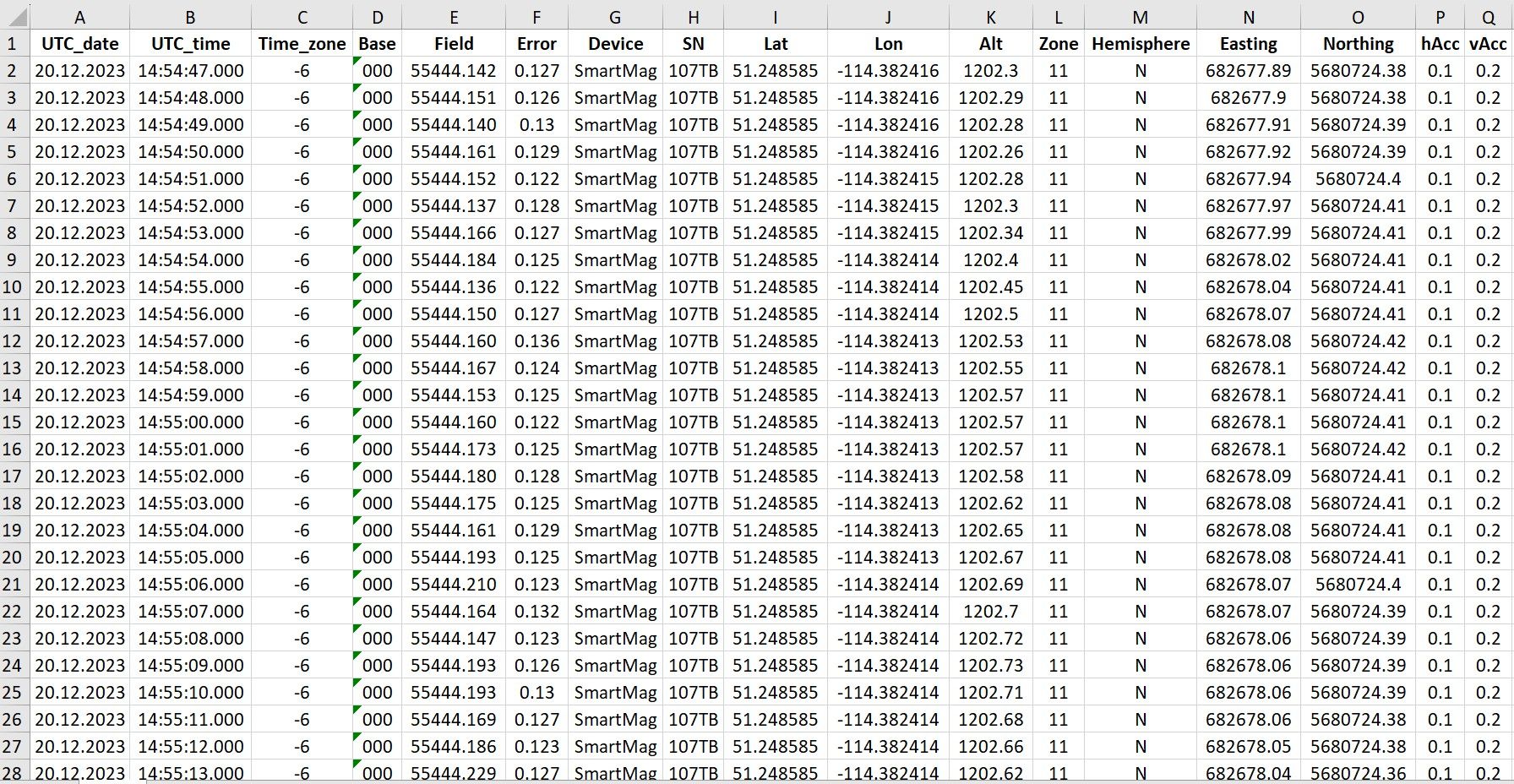 User can create project folders that can be used to divide survey sites or data collection days. All measurements are saved in a TXT file in the project folder. The file from each magnetometer has a name containing the serial number of the console, the code of the measurement mode and the number of connected sensors. The files have a homogeneous structure, i.e. each measurement in the file is a line that contains all necessary information: UTC date and time, time zone, base name, measured field, estimated error, sensor serial number, latitude and longitude in decimal degrees, altitude, UTM coordinates with automatic zone and hemisphere selection, horizontal and vertical accuracy.
