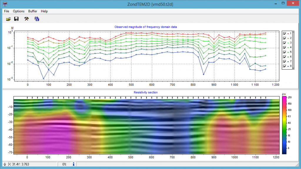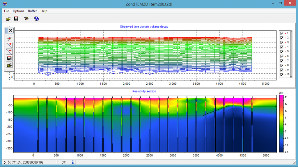 ZondTEM2D software is designed for two- dimensional Transient ElectroMagnetic (TEM) and frequency sounding for several observation systems ground and airborne. Comfortable interface and wide possibilities of data presentation allow to solve given geological problem with maximum effectiveness. While developing software special attention was payed to comfort and simplicity of its use, variety of visualization features and account of a priori data.